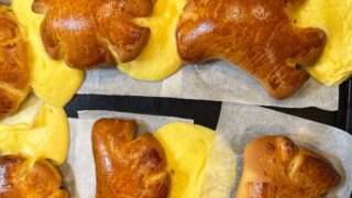 クリームパンを作りました。 …焼いたらクリームが全て流れて、ただのパンになりました😢 パンの中のカスタードはカスタードクリームパウダーを使ったのですが、それが良くなかったのかな。 思い返してみればパン生地で包もうと思ったと...